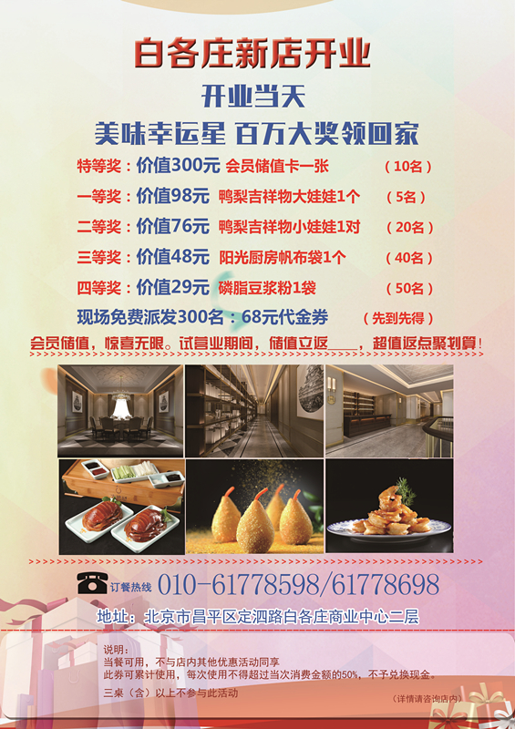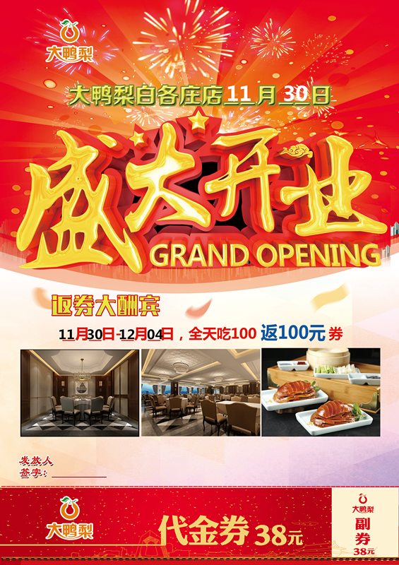 11月30日至12月4日,进店消费的顾客即可享受满100元返100元抵用券的优惠;开业当天,进店消费的顾客会员储值即可享受返点50%,惊喜多多,收获多多,让我们共同享受这舌尖上的鸭梨美味吧。