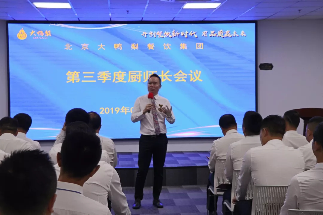 白驹过隙,第三季度8月份即将过半,作为大鸭梨的高管们,我们要不断的反思和总结经营管理的得与失,是否真正做到不遗余地的去执行公司“用品质赢未来”的品质战略。郭总在各事业部总厨的的工作汇报点评时指出:对本次事业部总厨的汇报给与充分的肯定,求真务实,体现价值,真实的反映出事业部的经营成果和存在的问题。这正是公司多年来对高管们严格要求并历练的成果。总经理郭琦家人在会上也向高管们郑重提出: