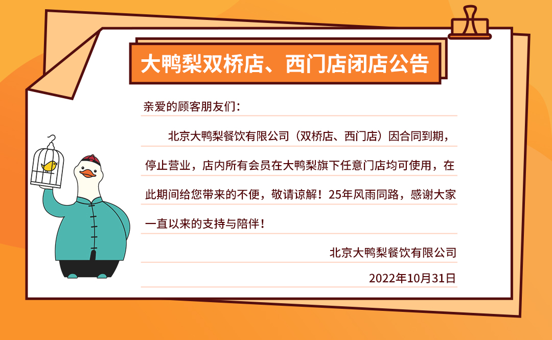 大鸭梨双桥店、西门店闭店公告